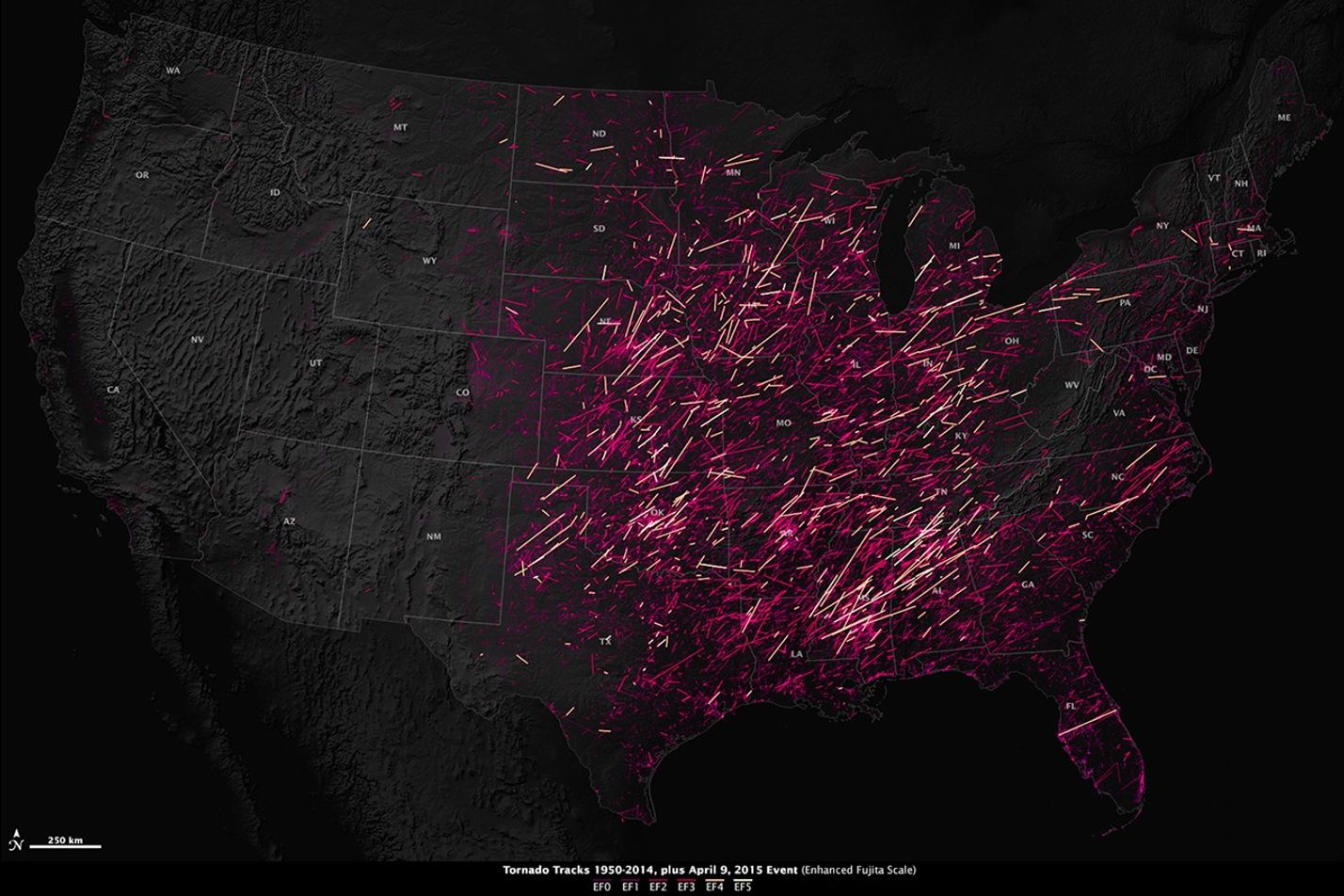 NASA Earth Observatory images by Joshua Stevens, using Landsat data from the U.S. Geological Survey and tornado track data from the NOAA National Weather Service Storm Prediction Center . Caption by Adam Voiland.