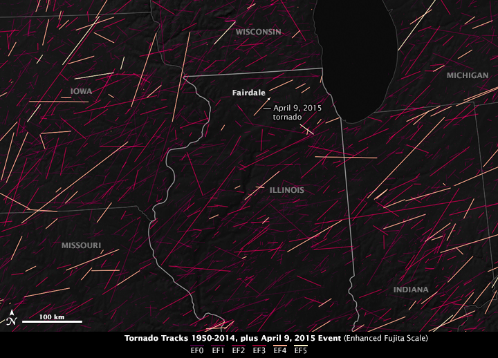 As seen from space, the aftermath of a tornado has a very different look. The Operational Land Imager (OLI) on Landsat 8 acquired this image of northern Illinois on April 10, 2015. Evidence of the Fairdale tornado appears as a line of damaged vegetation and disturbed soil scrawled across the agricultural landscape. Since Landsat 8 has a spatial resolution of 15 meters (49 feet) per pixel, individual houses are difficult to distinguish in such imagery. Whole towns appear as small patches of gray. To make it easier to distinguish the tornado track from surrounding fields, this false-color image combines shortwave infrared, near infrared, and green light (OLI bands 7-5-3). Living vegetation appears green and fallow or newly planted farm fields are shades of brown.