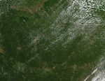 The image was taken by the Moderate Resolution Imaging Spectroradiometer (MODIS) on NASA’s Aqua satellite on April 28. The tracks were not present before the storm, as shown in the lower image from April 12, 2011.