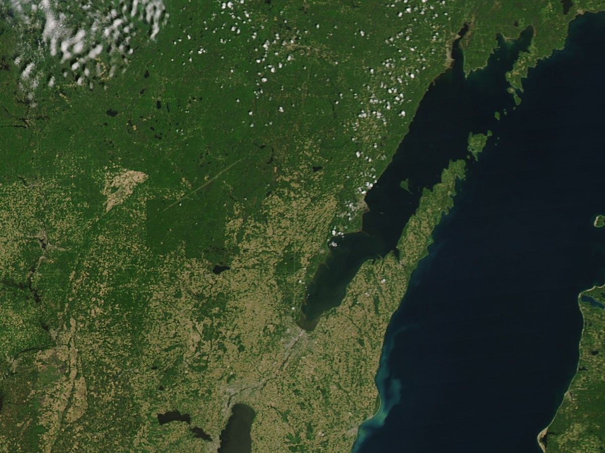 When the MODIS instrument on NASA’s Terra satellite observed the area on June 9, 2007, the track torn through the woods by one of the tornadoes stands out quite clearly. This photo-like image uses data collected by MODIS in the normal human vision range to give a familiar natural-looking appearance. The landscape is largely a checkerboard of farms, towns, roads, and cities. The pale land is predominantly farmland where crops have not fully grown in yet. Dark blue shows the winding path of rivers and lakes dotting the landscape. The large blue lake on the east (right) side of the image is Lake Michigan. Towns and cities, including the city of Green Bay, are gray. To the north side, farmland gives way to dark green as land use shifts from agriculture to the Menominee Indian Reservation and Nicolet National Forest. The diagonal slash through the dark green forested land shows the tornado track. Bare land was revealed where the tornado tore down trees or stripped vegetation off the branches.