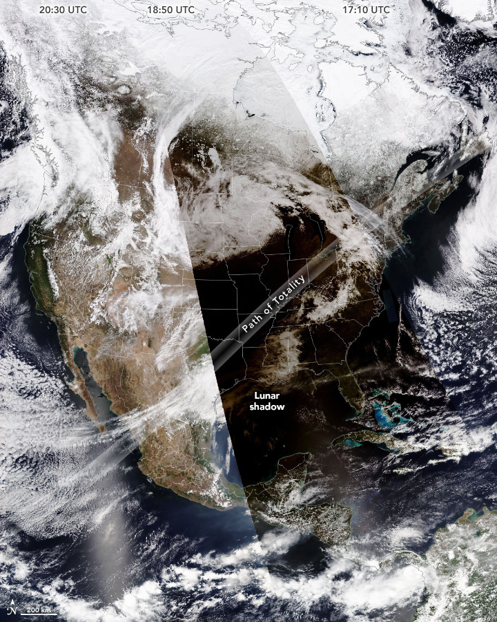 As people in the 115-mile-wide (185-kilometer-wide) path of totality looked up and saw the Moon conceal the bright orb of the Sun and obscure all but its wispy corona, Earth-observing satellites captured imagery of the Moon’s shadow as it raced eastward over North America.