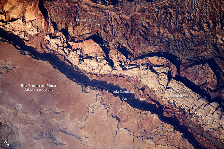 Today, they are some of the most well-known rocks of the Colorado Plateau, including the Moenkopi, Chinle, Navajo, Entrada, and Dakota formations. Several of these are visible in the below image of Big Thomson Mesa within Capitol Reef. The photograph was taken on June 14, 2009, by the crew on the International Space Station.