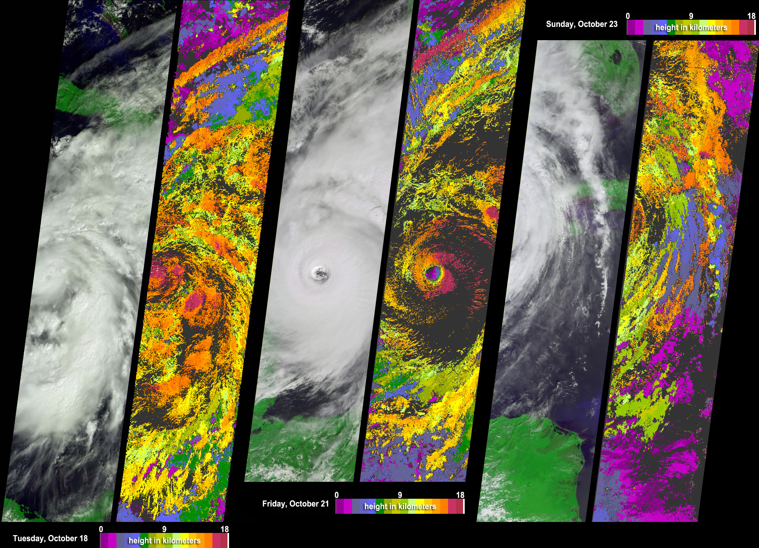 On the 18th, Wilma looked a bit ragged. Its eye is located at the center of the left edge, and its outer bands of clouds appear to be dominated by a rather loose collection of thunderstorms. In the photo-like images, these look like areas of “boiling clouds,” and in the cloud-height image, these appear as orange blobs, sometimes topped with pinkish-red. On October 21 (center), when Wilma was a Category 4 storm, cloud-top height on the eastern side of the storm near the eye reached 18 kilometers in altitude, with lower heights on the western side. The image from the 23rd shows the eastern edge of Wilma as it approached Florida (upper right) and Cuba (center right).