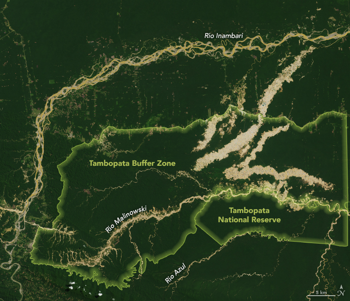 As revealed in these images and maps, forest losses were concentrated in the buffer zones around protected areas, such as the Tambopata National Reserve. Lands belonging to the Kotsimba Native Community, an indigenous Peruvian tribe, are also experiencing high rates of forest loss, especially due to gold mining. Those losses are concentrated along the Malinowski River, where small-scale mining operations use water from Amazonian rivers for gold amalgamation, a process to extract gold from a surrounding raw ore using mercury. Nearly half of forest loss in Nicolau’s image analysis occurred outside of legal mining concession areas.