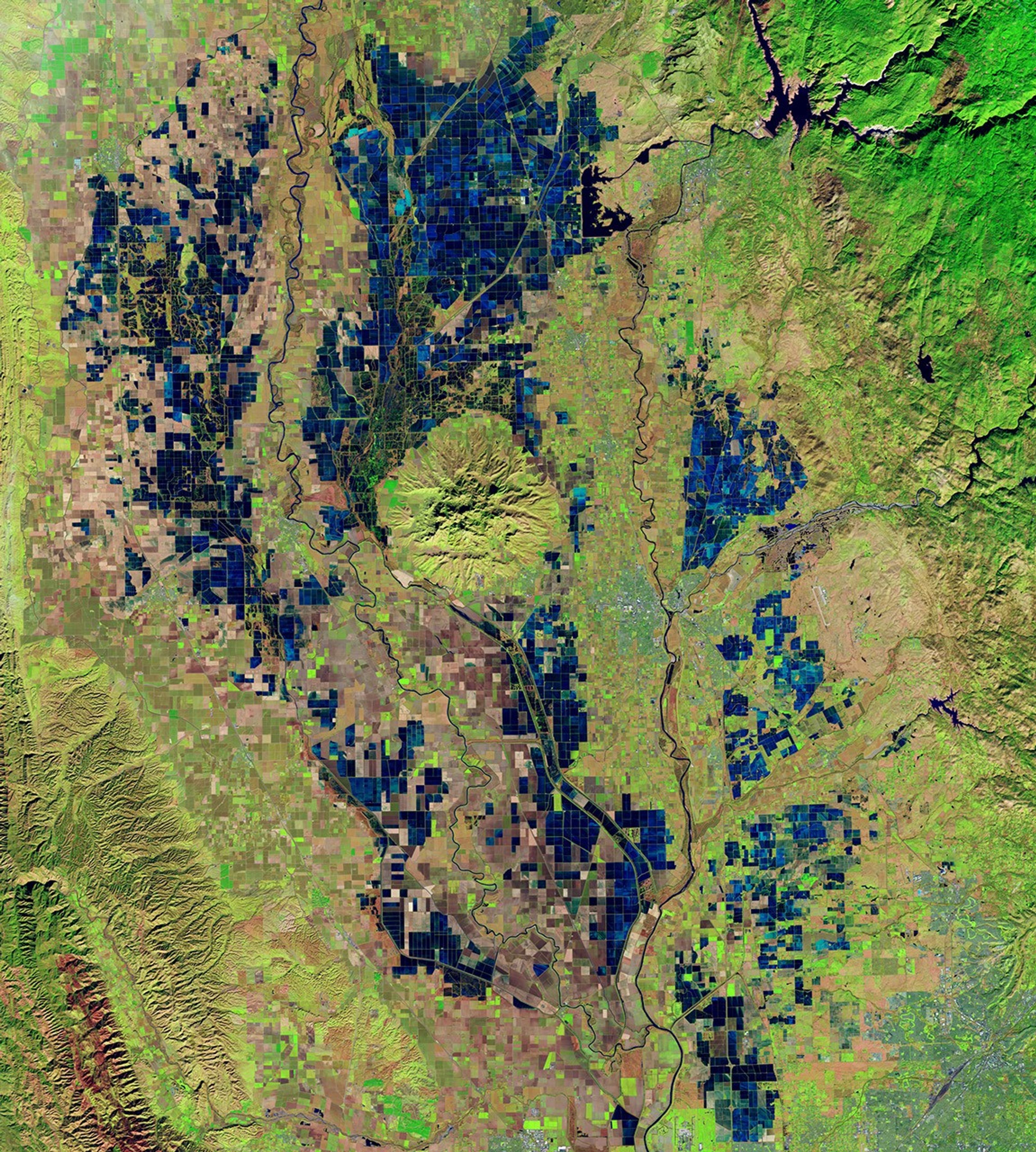 Maps by NASA Earth Observatory, using data provided by the OpenET team at NASA and the Desert Research Institute, available at openetdata.org and described in research by Volk, J.M. et al . Landsat image by Lauren Dauphin using data from the U.S. Geological Survey . The OpenET consortium includes NASA, USGS, and the U.S. Department of Agriculture working with the Desert Research Institute and nearly a dozen other universities, Environmental Defense Fund, and Google Earth Engine. Story by Emily DeMarco (NASA Earth Science Division) adapted for Earth Observatory by Kathryn Hansen.
