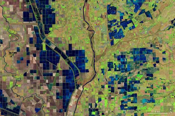 OpenET’s primary observations come from the Landsat 8 and 9 satellites, a partnership between NASA and the U.S. Geological Survey. The second image above, acquired with the OLI (Operational Land Imager) on Landsat 8, highlights a patchwork of flooded rice fields along the Sacramento and Feather rivers on December 26, 2018. In this false-color image, inundated fields appear dark blue and vegetation is bright green.