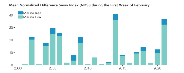 The bar chart below shows the Normalized Difference Snow Index (NDSI) for Hawai'i as observed by NASA’s Terra satellite. NDSI incorporates a blend of visible light and shortwave infrared to assess the amount of snow within a given geographic area. The chart shows the combined NDSI for Mauna Loa (teal) and Mauna Kea (blue) for the first week of February in each year from 2001 to 2021. The combined weekly NDSI in 2021 for the two volcanoes is the highest since 2014 and second-highest in the record.