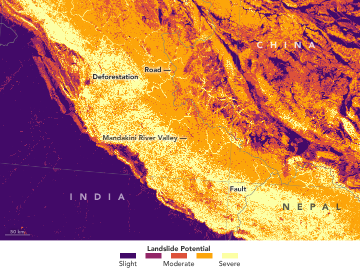 NASA Earth Observatory image by Michala Garrison, using topographic data from the Shuttle Radar Topography Mission (SRTM). Landslide susceptibility map by Jesse Allen, using data provided by Thomas Stanley and Dalia Kirschbaum (NASA/GSFC), and topographic data from SRTM. Canyon and rock fold images by Joshua Stevens , using topographic data from SRTM and Landsat data from the U.S. Geological Survey . Story by James Riordon/NASA’s Earth Science News Team.