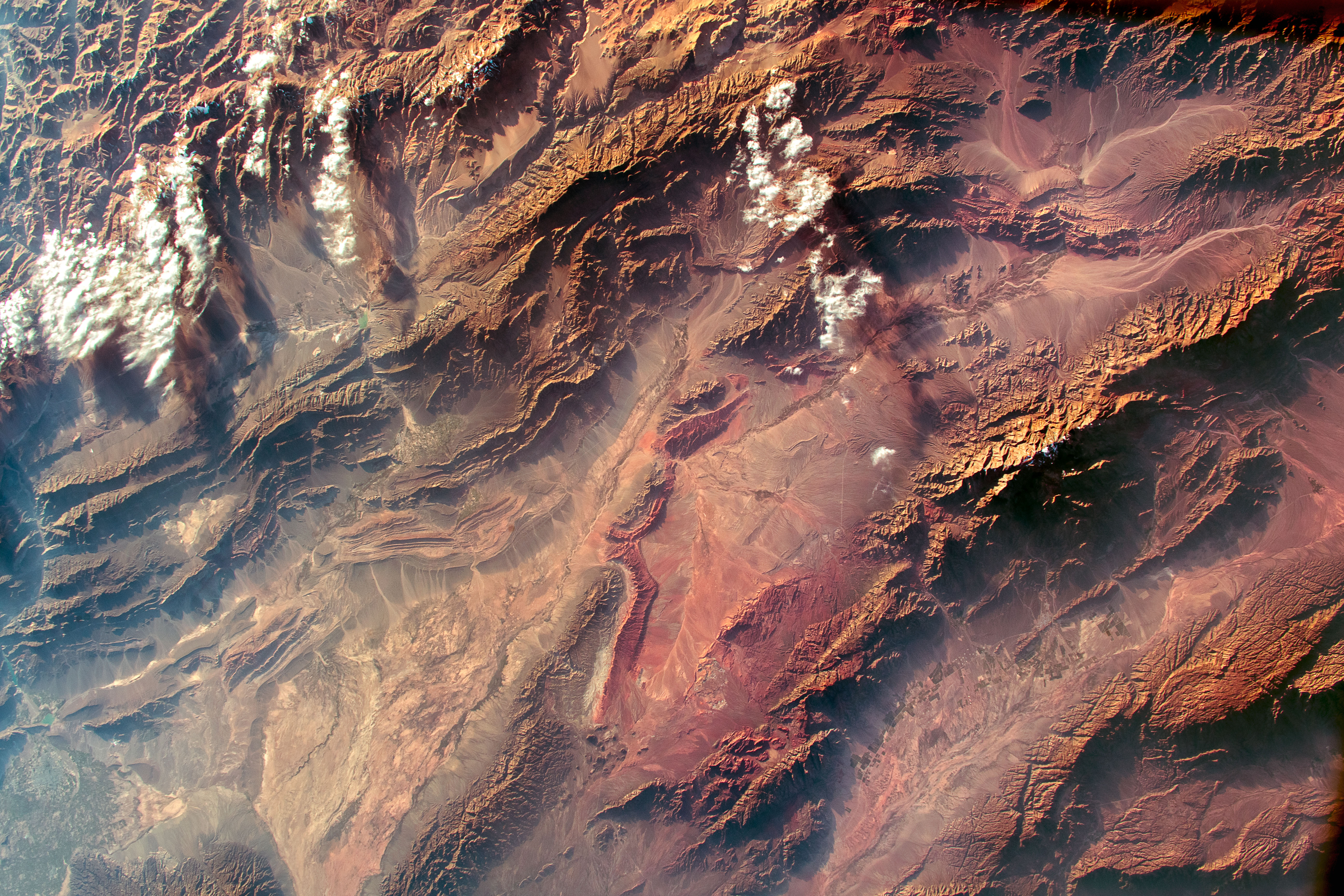 An astronaut onboard the International Space Station (ISS) took this photograph of Talampaya National Park in the La Rioja Province of Argentina. The high deserts of western Argentina lie in the rain shadow of the Andes mountains, which causes rain and snow to fall on the west side of the range and leads to a dry climate on the east side. Shadows cast to the east of the mountain peaks indicate that this photo was taken during the local late afternoon.