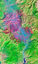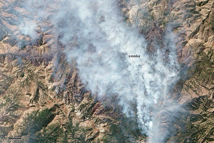 The Advanced Land Imager (ALI) on the Earth Observing- 1 (EO-1) satellite acquired these images of the affected area on August 28, 2012. In the natural color image (top), heavy smoke streams northward. Charred vegetation appears red in the false-color image (bottom); unburned vegetation is green.
