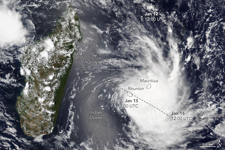 The MODIS (Moderate Resolution Imaging Spectroradiometer) on NASA’s Terra satellite acquired the top image at about 06:00 Universal Time (10 a.m. in Réunion) on January 14. The storm strengthened that day to the equivalent of a category-2 hurricane, with sustained winds of at least 160 kilometers (100 miles) per hour.