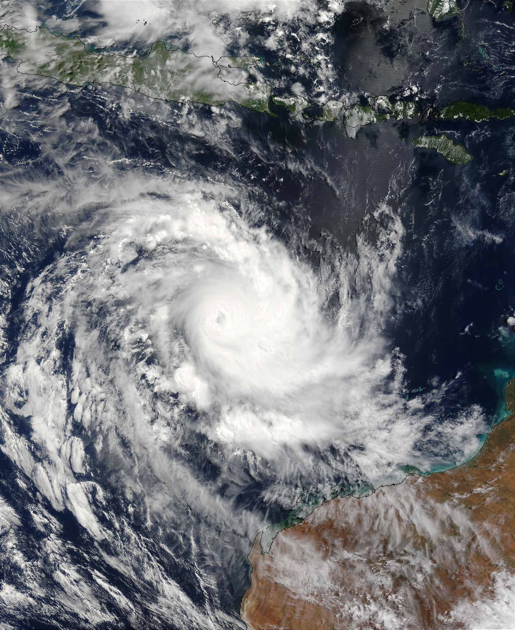 As of April 7, the storm was predicted to continue weakening as it moved toward land, but it could still bring heavy rains to Western Australia and the Northern Territory. In this image, the outer bands of storm clouds have reached the Australia coast and extend northward over the Timor Sea almost all the way to the island of Timor at the top of the image. The storm was predicted to make landfall Monday night or Tuesday, and residents were being warned to prepare for winds in excess of 105 miles per hour.