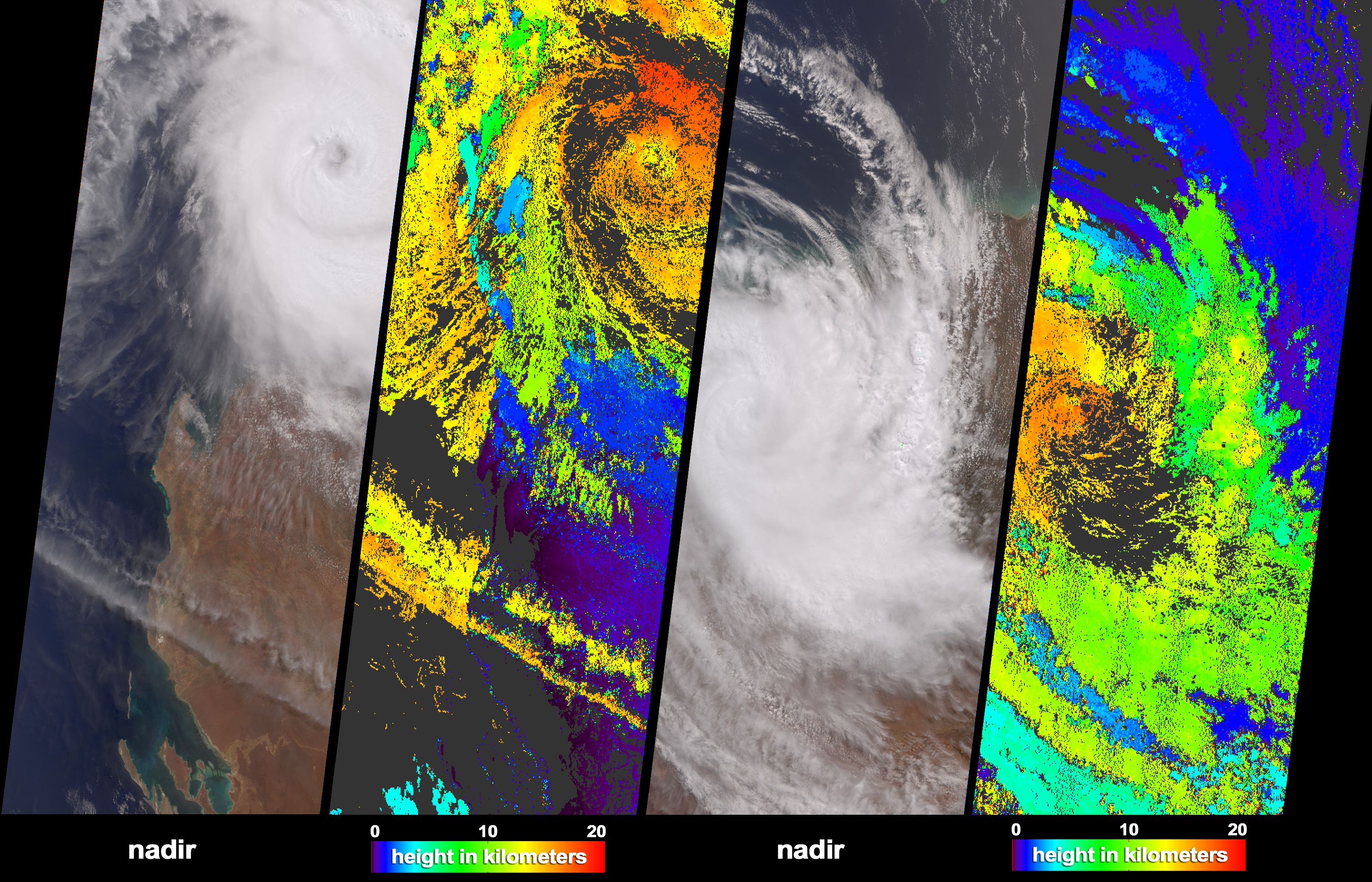 The natural color images cover much of the same area, although the right-hand panels are offset slightly to the east. Automated stereoscopic processing of data from multiple MISR cameras was utilized to produce the cloud-top height fields. The distinctive spatial patterns of the clouds provide the necessary contrast to enable automated feature matching between images acquired at different view angles. The height retrievals are at this stage uncorrected for the effects of the high winds associated with cyclone rotation. Areas where heights could not be retrieved are shown in dark gray.