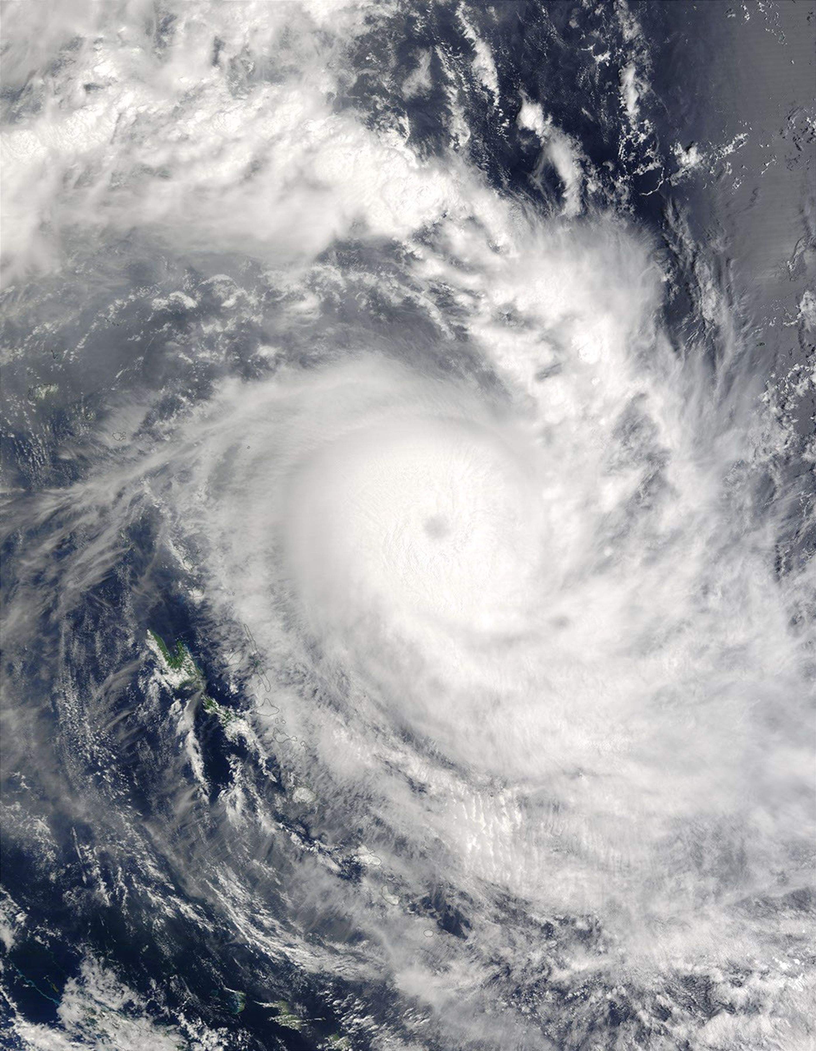 The above image of Cyclone Zoe was taken by the Moderate Resolution Imaging Spectroradiometer (MODIS) instrument aboard NASA’s Terra satellite on December 29, 2002. The image shows the cyclone off the coast of the Banks Islands, heading northwest into the Solomon Islands. The cyclone was packing sustained winds of over 225 miles (360 kilometers) per hour when it struck Tikopia and Anuta.