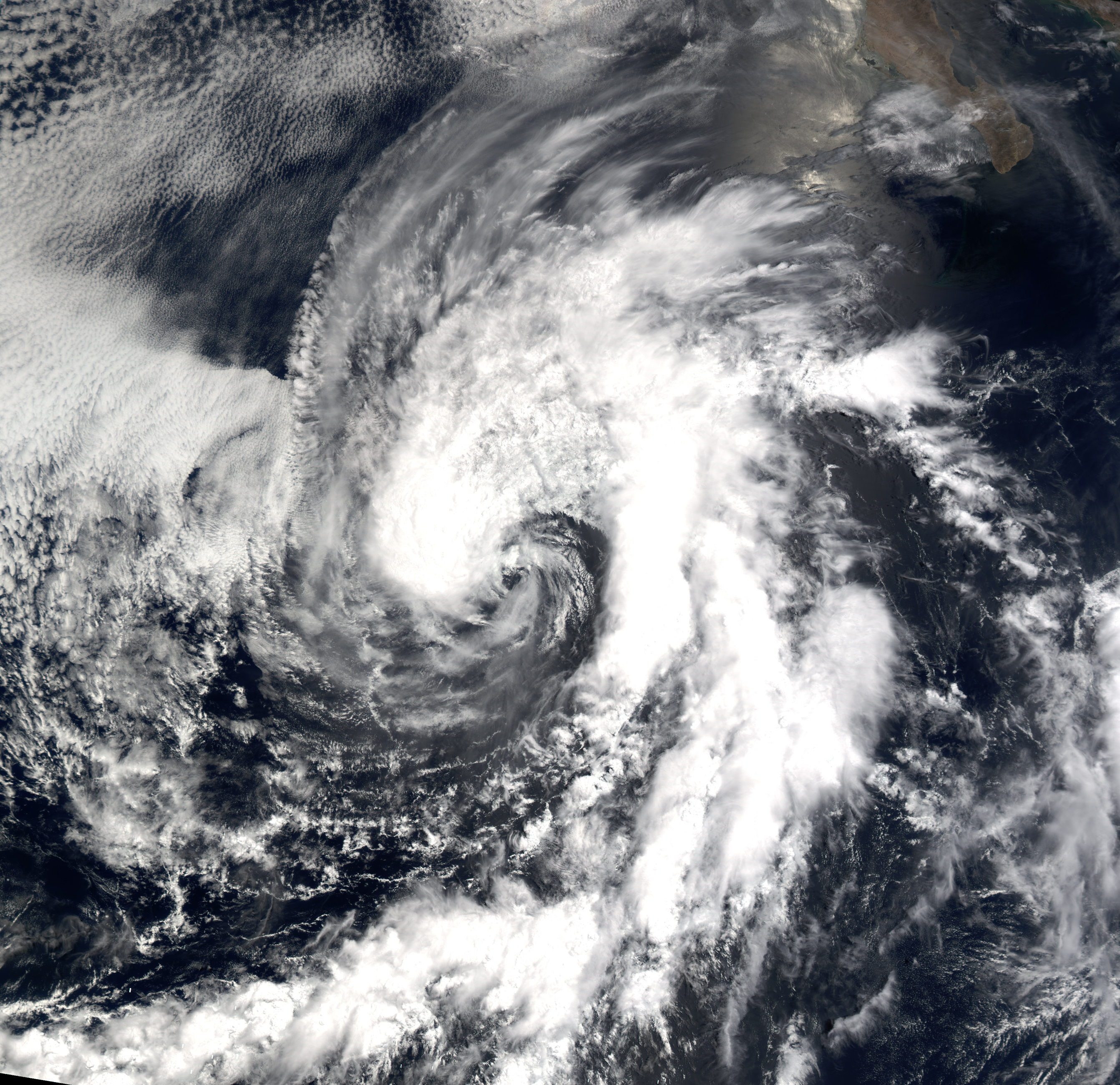 The typhoon, which formed to the south a few days ago, moved northward and headed toward Baja California before turning west and dissipating in the eastern Pacific. When this image was taken, the tropical storm bore sustained winds of over 63 kilometers (39 miles) per hour. Currently, sustained winds are at 46 kilometers (28 miles) per hour.