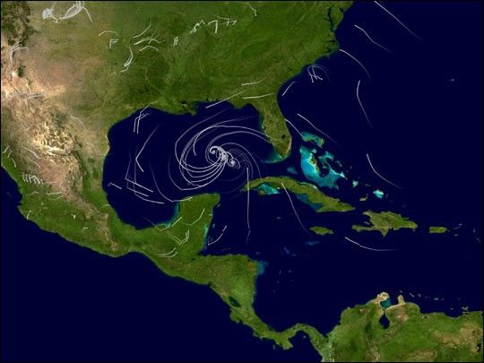 This series of images shows the development of the storm. The earliest image (bottom image in the trilogy) shows the storm in the southeastern Caribbean soon after it had formed. The image was taken 10:41 p.m. local time on August 24, 2006, (02:41 UTC on August 25) by the Tropical Rainfall Measuring Mission (TRMM) satellite. Rain rates in the center swath are from the TRMM Precipitation Radar, while those in the outer swath are from the TRMM Microwave Imager. The rain rates are overlaid on infrared data from the TRMM Visible Infrared Scanner. Scattered areas of light (blue) to moderate (green) rain and little evidence of classic hurricane organization reveal that the system was still in its early stages of development.