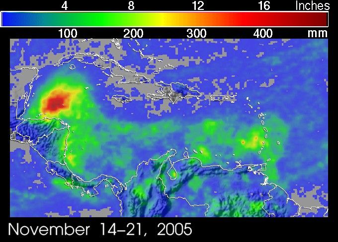 Though Gamma was never well formed enough to track with photo-like visible imagery, its progress across the Caribbean is abundantly clear in this rainfall accumulation image. The image, collected by the Tropical Rainfall Measuring Mission (TRMM) satellite, shows rainfall totals measured between November 14 and November 21, 2005. The heaviest totals, shown in deep red, are off the north coast of Honduras, where as much as 500 millimeters (20 inches) fell. Lighter totals radiate out from the center of the storm over the coast. The next heaviest totals are over St. Vincent and immediately west, not far from where the storm formed. Between St. Vincent and Honduras, a path of green, representing rainfall totals of 100 to 200 mm (4-8 inches), shows Gamma’s track across the Caribbean.