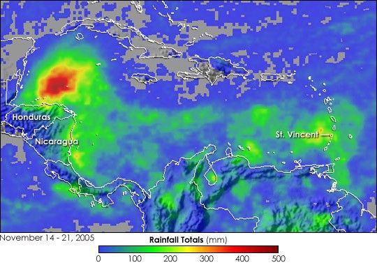 Though Gamma was never well formed enough to track with photo-like visible imagery, its progress across the Caribbean is abundantly clear in this rainfall accumulation image. The image, collected by the Tropical Rainfall Measuring Mission (TRMM) satellite, shows rainfall totals measured between November 14 and November 21, 2005. The heaviest totals, shown in deep red, are off the north coast of Honduras, where as much as 500 millimeters (20 inches) fell. Lighter totals radiate out from the center of the storm over the coast. The next heaviest totals are over St. Vincent and immediately west, not far from where the storm formed. Between St. Vincent and Honduras, a path of green, representing rainfall totals of 100 to 200 mm (4-8 inches), shows Gamma’s track across the Caribbean.