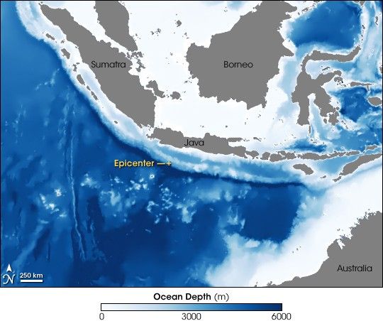 This image shows the region’s bathymetry. Just as a topographic map shows the height of land surface features above sea level, bathymetry shows the depth below sea level. In this image, darker blue corresponds with greater depth. The water is shallowest closest to the islands, getting considerably deeper east of Borneo, and south of Java and Sumatra. The epicenter of the earthquake is approximately 250 kilometers off the coast of Java. Marked in yellow, the epicenter appears along a ridge where the ocean floor rises fairly abruptly from greater depths. Flat gray areas indicate landmasses.