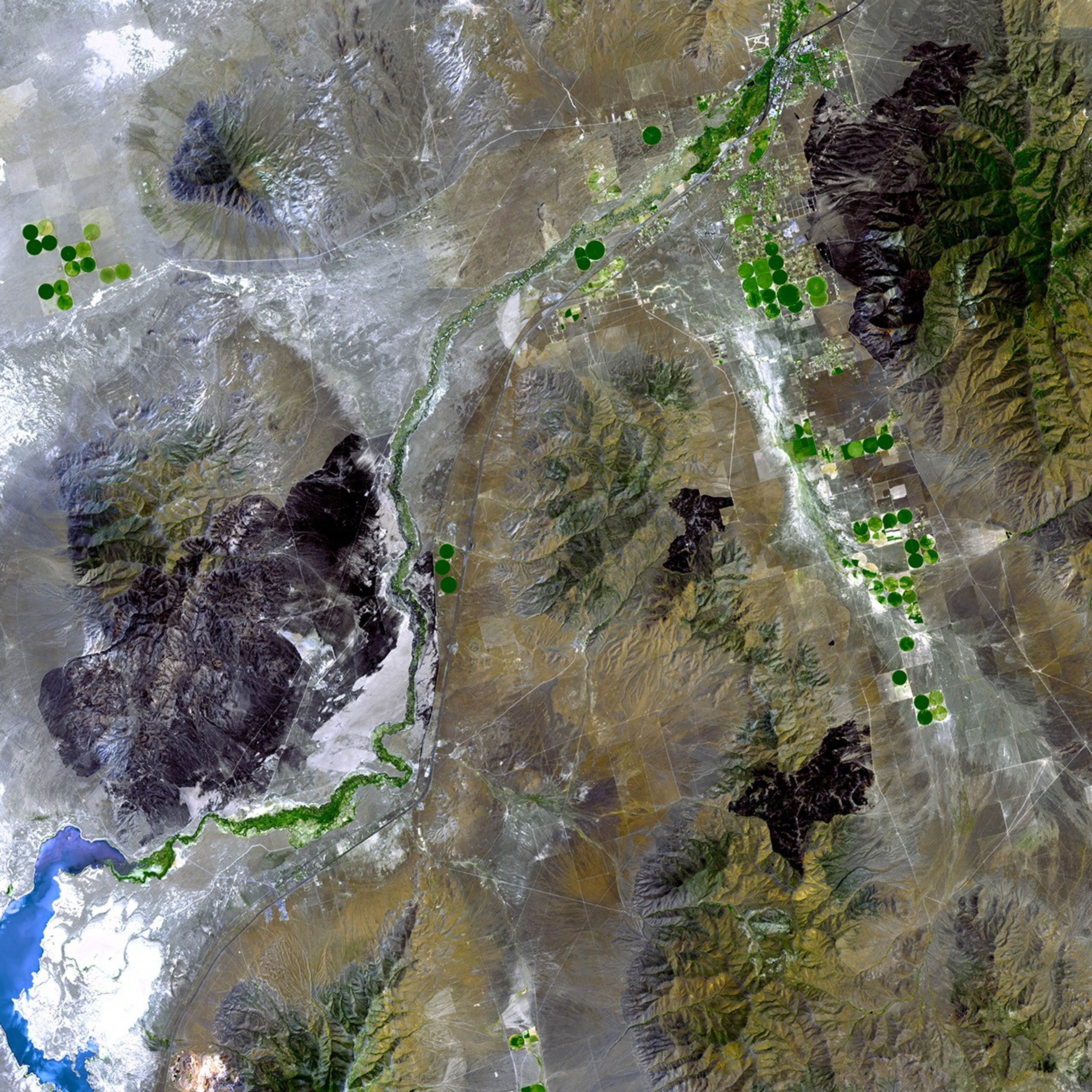 On July 22, 2007, the Advanced Spaceborne Thermal Emission and Reflection Radiometer (ASTER) flying on NASA’s Terra satellite captured this image of burn scars from the Thomas, Tungsten, and some smaller fires in Nevada. In this image, brown-black indicates a burn scar, green indicates vegetation, tan indicates bare rock, and blue indicates water. Throughout the image, burn scars blot the otherwise tan or green landscape like spilled ink.
