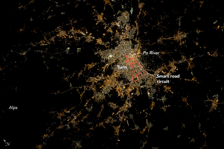 An astronaut onboard the International Space Station (ISS) took this nighttime photograph of the city of Turin in northwestern Italy, home to many Italian car companies and automotive manufacturing plants. Through Italy’s 2018 Smart Road Decree, Turin was chosen as a test site for autonomous driving vehicles. The smart road circuit map for self-driving cars has been traced onto the photo below (resolution approximately 15 meters per pixel) using image editing software and GIS techniques.