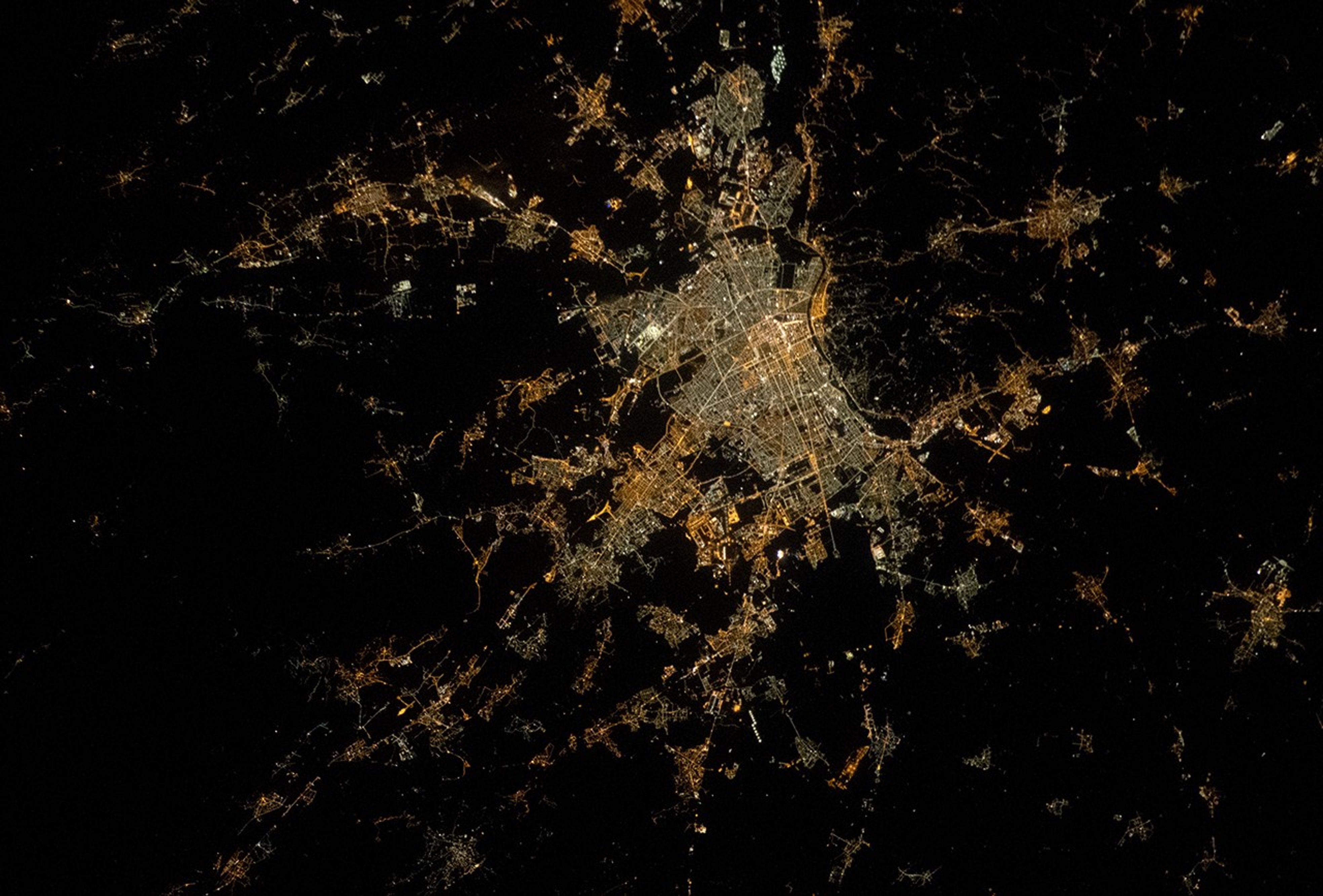 An astronaut onboard the International Space Station (ISS) took this nighttime photograph of the city of Turin in northwestern Italy, home to many Italian car companies and automotive manufacturing plants. Through Italy’s 2018 Smart Road Decree, Turin was chosen as a test site for autonomous driving vehicles. The smart road circuit map for self-driving cars has been traced onto the photo below (resolution approximately 15 meters per pixel) using image editing software and GIS techniques.