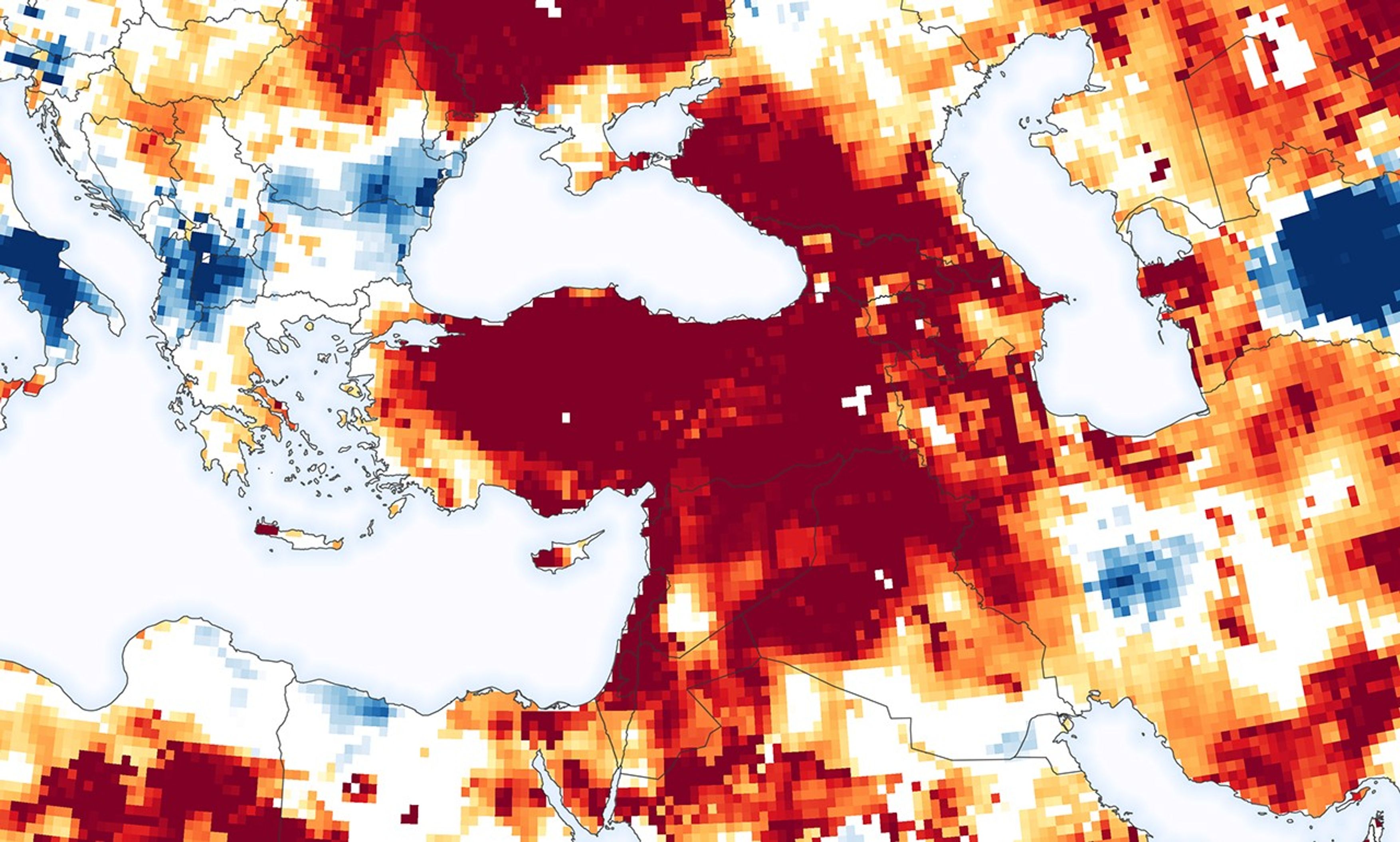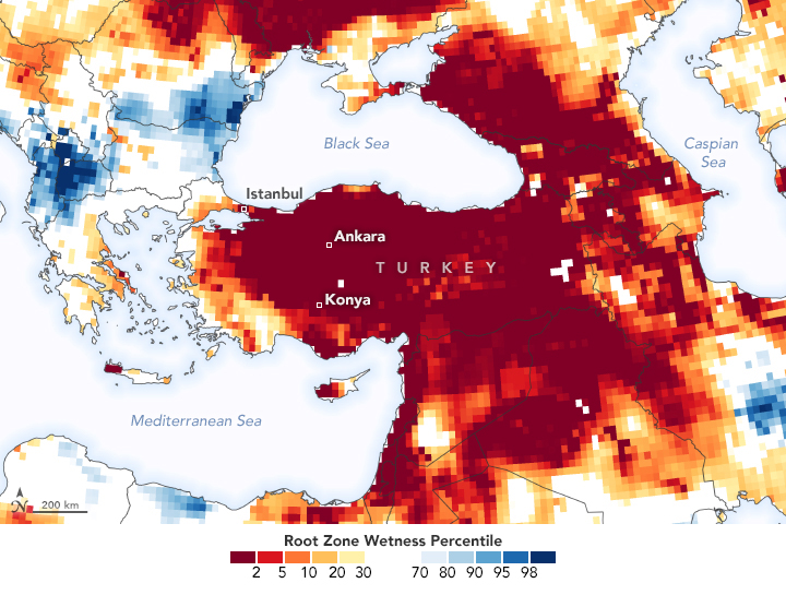As 2021 begins, most of Turkey is experiencing severe drought. Numerous reservoirs around Istanbul—the country’s most populous city (15 million)—have reached their lowest water storage levels in 15 years. Crop production could be threatened if conditions persist.