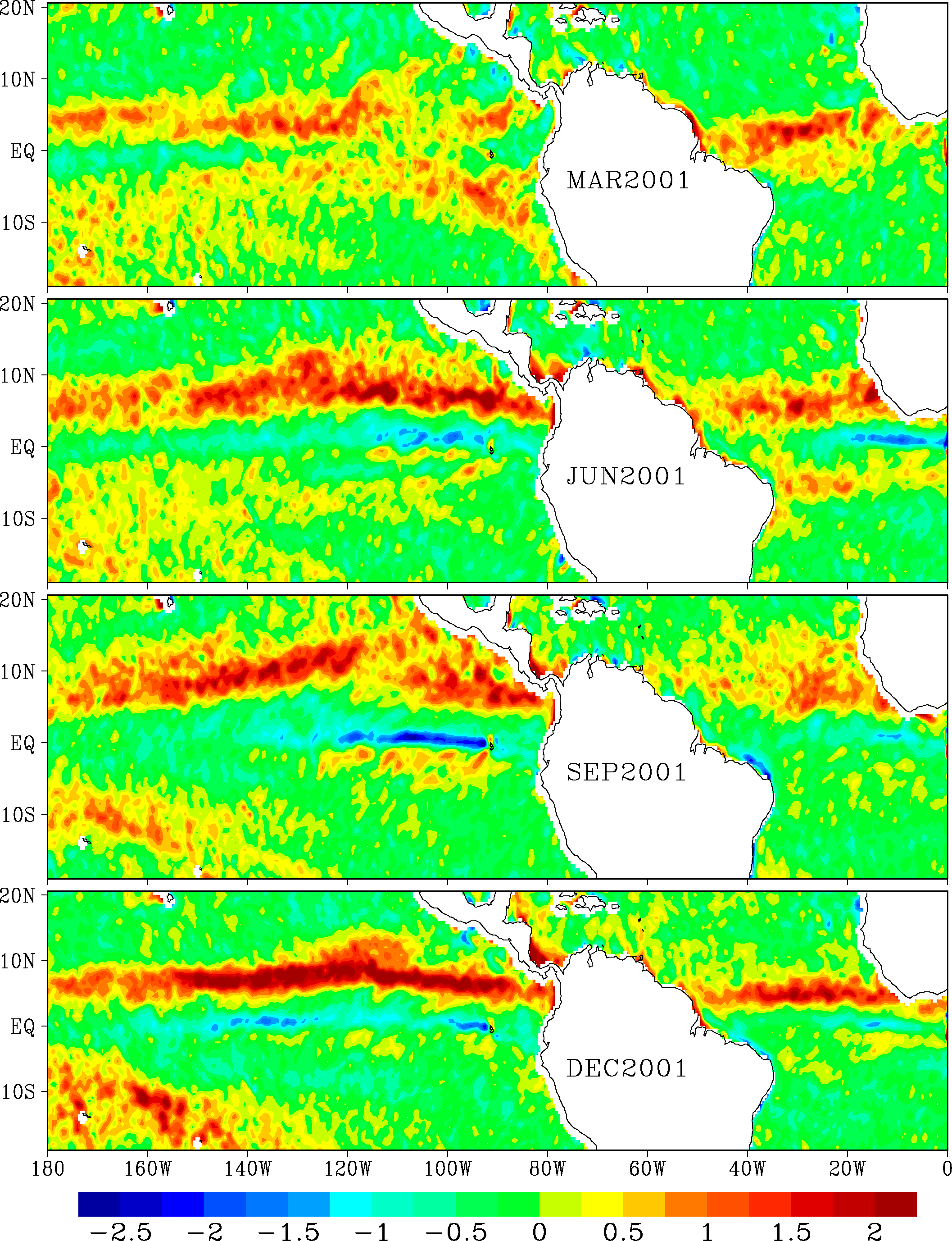 “The double ITCZ is usually only identified in the Pacific and AtlanticOceans on a limited and seasonal basis,” said Timothy Liu, of NASA’s JetPropulsion Laboratory and California Institute of Technology, Pasadena, Calif.,and lead researcher on the project. In the eastern Pacific Ocean, the southernITCZ is usually seen springtime. In the western Atlantic Ocean, the southernITCZ was recently clearly identified only in the summertime.