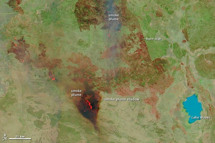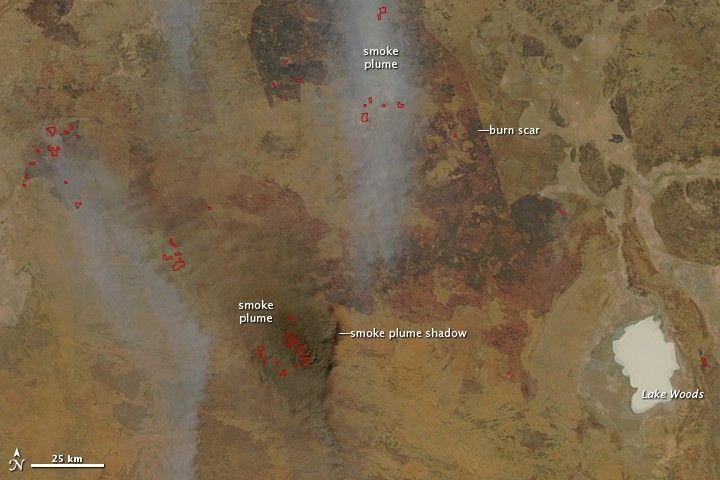 Wildfires burned across the Northern Territory in September 2012 as Australian winter gave way to spring. The Moderate Resolution Imaging Spectroradiometer (MODIS) on NASA’s Aqua satellite observed smoke and fires in an area west of Lake Woods on September 18, viewing the event in different ways.