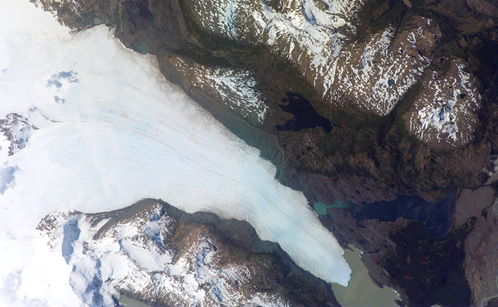 Tyndall Glacier is located in the Torres del Paine National Park in Chile. This glacier, which has a total area of 331 square kilometers and a length of 32 kilometers (based on 1996 measurements), begins in the Patagonian Andes Mountains to the west and terminates in Lago Geikie. These images compare the extent of the glacier in 2007 (astronaut photo, top) and 1990 (Landsat satellite image, bottom).