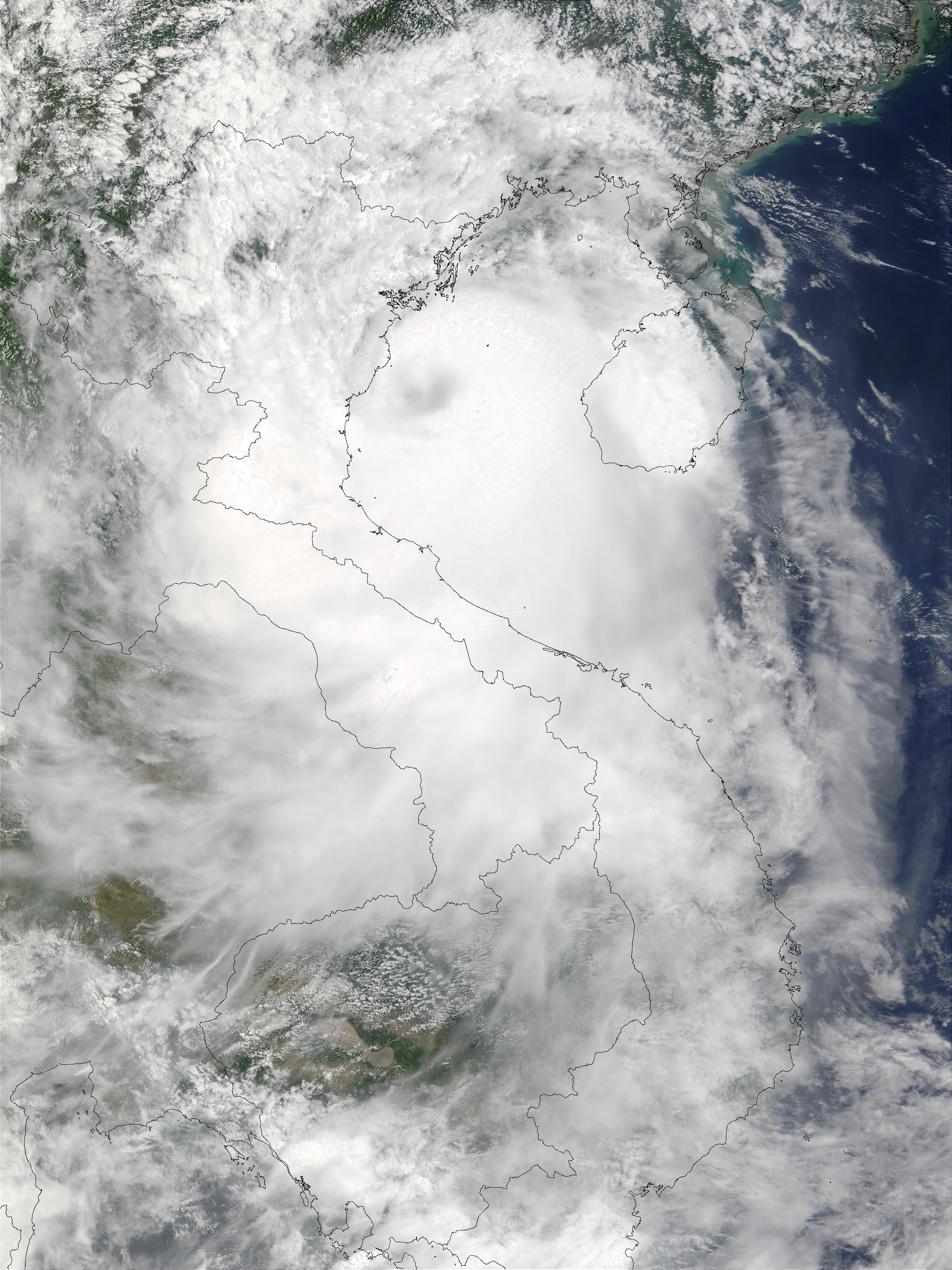 Centered in the Gulf of Tongking, Typhoon Koni sprawls over Vietnam (center), and part of Laos (to the east). The eastern edge of the storm drapes the island of Hainan, south of China. This Moderate Resolution Imaging Spectroradiometer (MODIS) image is from the Terra satellite on July 22, 2003.