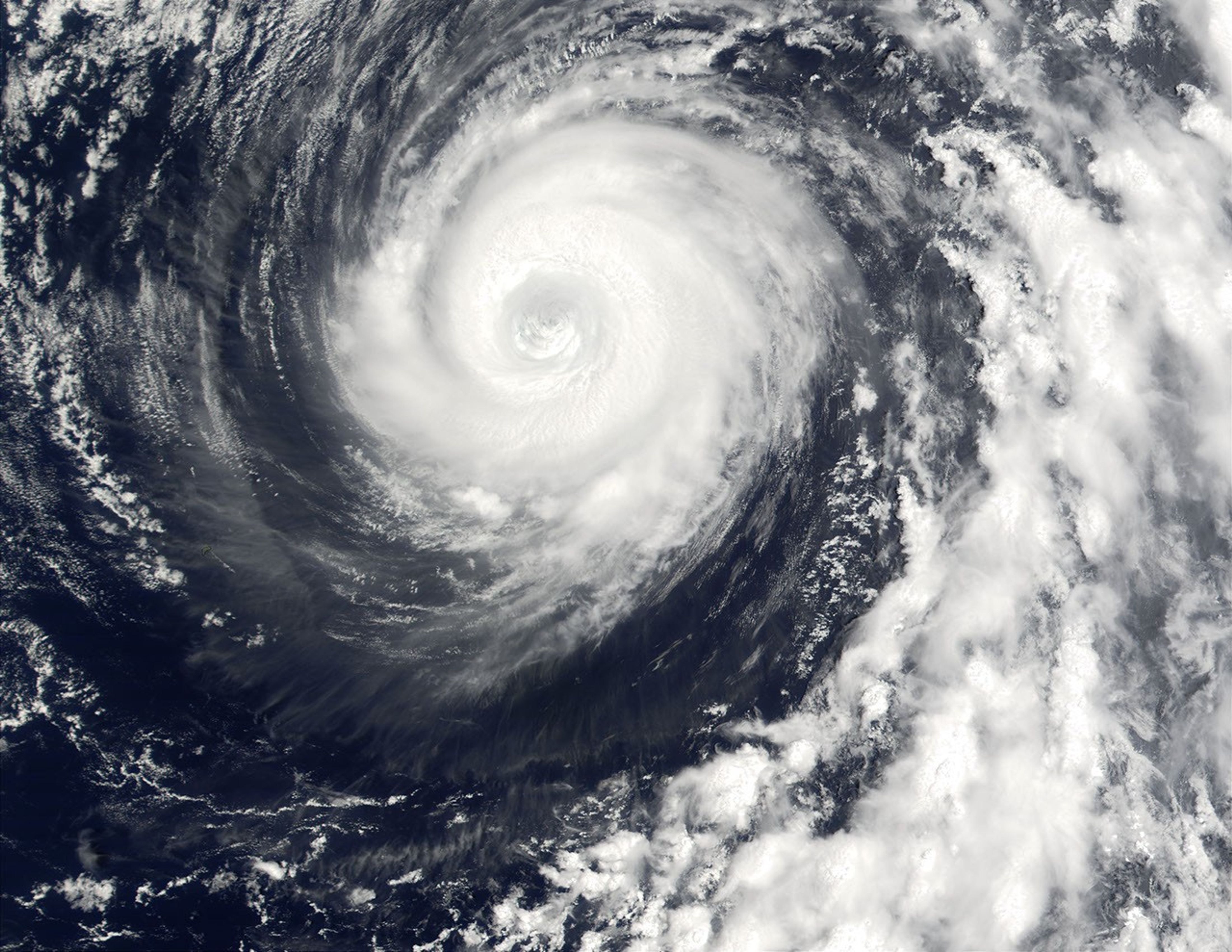 This true-color Moderate-resolution Imaging Spectroradiometer (MODIS) image shows Typhoon Man-Yi on Aug. 6, 2001, spinning in the Pacific Ocean just east of the Bonin Islands and northeast of Iwo Jima. In this scene, the eye of the storm is located about 1,000 km (620 miles) southeast of Japan's main island of Honshu. Typhoon Man-Yi passed directly over the Mariana Islands on Aug. 4.