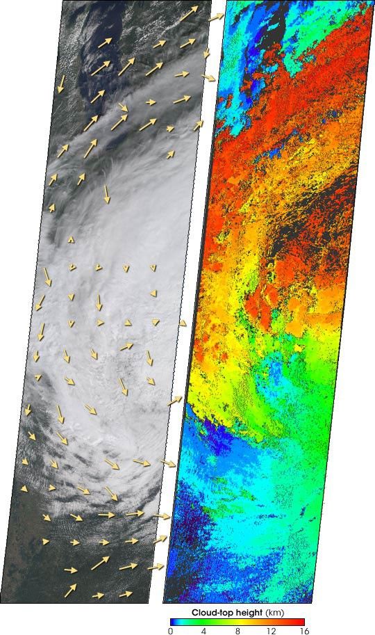 Typhoon Nabi was a Category 2 typhoon in the western Pacific when the Moderate Resolution Imaging Spectroradiometer (MODIS) on NASA’s Terra satellite captured this image on September 6, 2005 at 11:05 a.m. Tokyo time. It had sustained winds of around 160 kilometers an hour (100 miles per hour), and it was heading north across the southern end of Japan. The eye of the storm is roughly centered in the image, and the thick storm clouds completely hide the island of Kyushu. To the northeast of the eye, the smaller island of Shikoku and the largest Japanese island, Honshu, are also under the clouds.