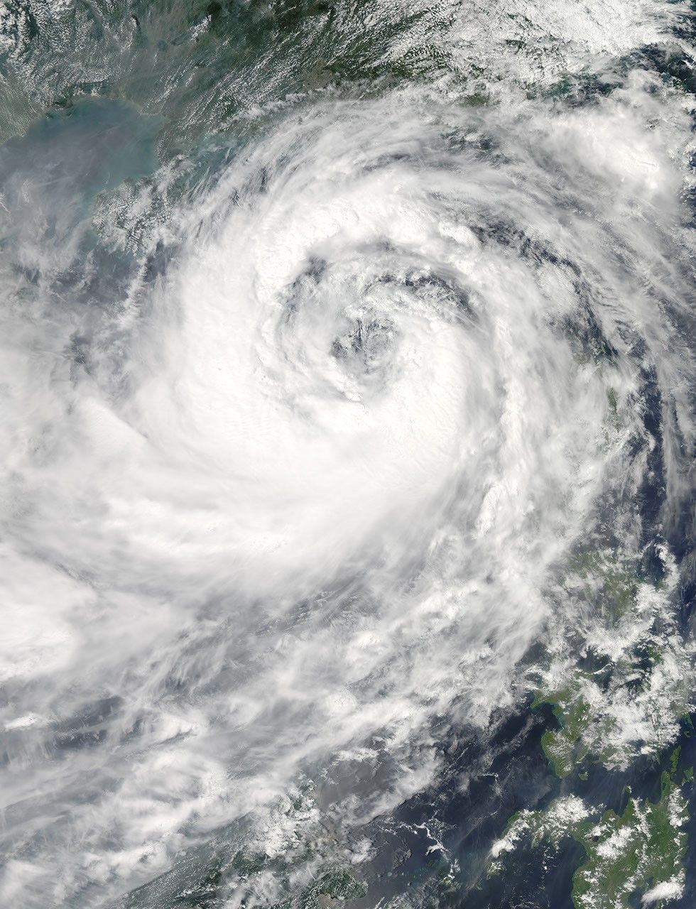 Typhoon Nesat sprawled across most of the South China Sea on the afternoon of September 28, 2011, when the Moderate Resolution Imaging Spectroradiometer (MODIS) on the Aqua satellite acquired this image. Bands of clouds spiral loosely around the center of a storm weakened by its encounter with mountainous Luzon, the largest island in the Philippines. When MODIS took this image at 1:35 p.m. local time, Nesat had winds of 65 knots (120 kilometers per hour or 75 miles per hour), making it a weak Category 1 storm on the Saffir-Simpson Hurricane Wind Scale.
