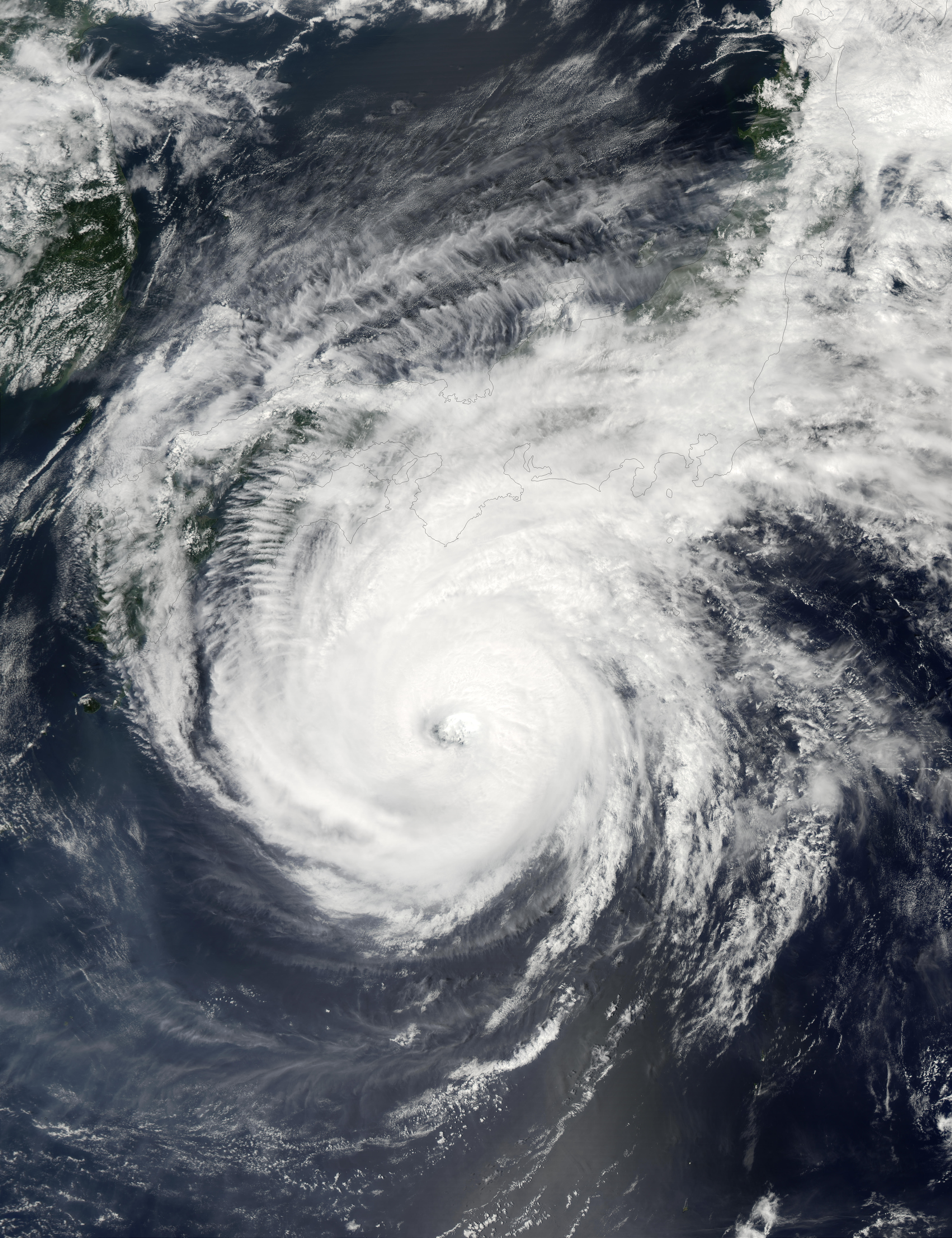 On August 18, 2002, Typhoon Phanfone moved slowly north along the coast of Japan, dumping over 9 inches of rain on parts of the island nation and generating winds of over 76 miles (126 kilometers) per hour. This image of the typhoon was taken on August 18 by the Moderate Resolution Imaging Spectroradiometer (MODIS), flying aboard NASA’s Terra spacecraft. The typhoon caused no deaths and led to some transportation disruptions along the Japanese coast. Phanfone is expected to continue traveling up the coast of Japan and dissipate into a tropical storm without coming aground on the main island.