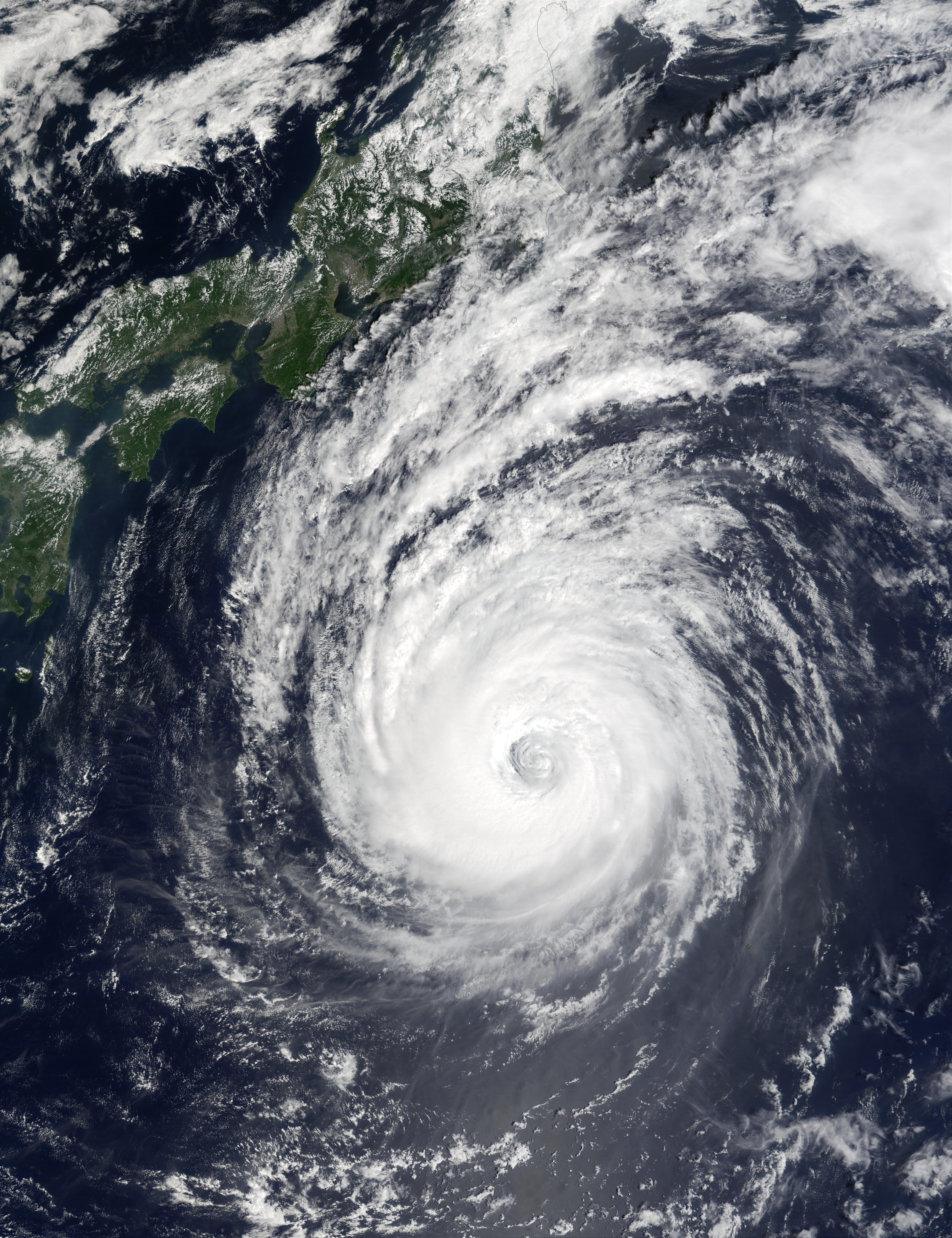 On August 17, 2002, Typhoon Phanfone was roughly 200 miles (320 kilometers) south of Tokyo and packing surface winds of up to 90 miles (145 kilometers) per hour. This image of the typhoon was taken on August 17 by the Moderate Resolution Imaging Spectroradiometer (MODIS), flying aboard NASA’s Terra spacecraft. In the two days following this image, the storm dropped slightly in intensity, hovered just off Japan, and then slowly moved northeast just off the eastern coast of the island nation. Several people were reported as missing at sea near the coast of the Japanese state of Kanagawa, and the typhoon led to some transportation disruptions in parts of Japan.