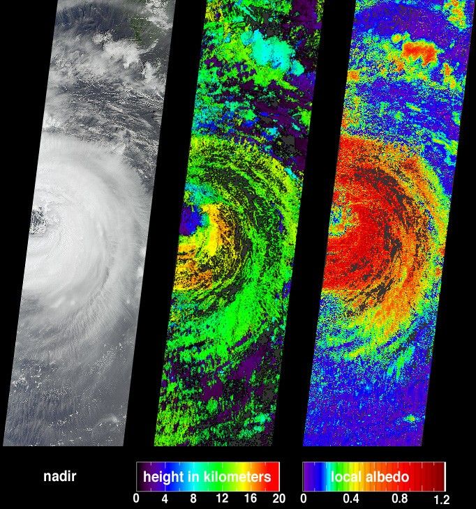 Clouds have a significant influence on the global radiation balance of theEarth’s atmosphere, and the improvement of climate models requires more accurateinformation on how different types of clouds influence Earth’s energy budget.One measure of this influence is albedo, which is the amount of sunlightreflected back to space divided by amount of incident sunlight. Bright objectshave high albedo. Retrieved local albedo values for Typhoon Sinlaku are shown atright. Generation of this product is dependent on observed cloud radiances as afunction of viewing angle and the cloud height field. Over the short distances(2.2 kilometers) that MISR’s local albedo product is generated, values can begreater than 1.0 due to the contributions from the sides of the clouds. Areaswhere albedo could not be retrieved are shown in dark gray.