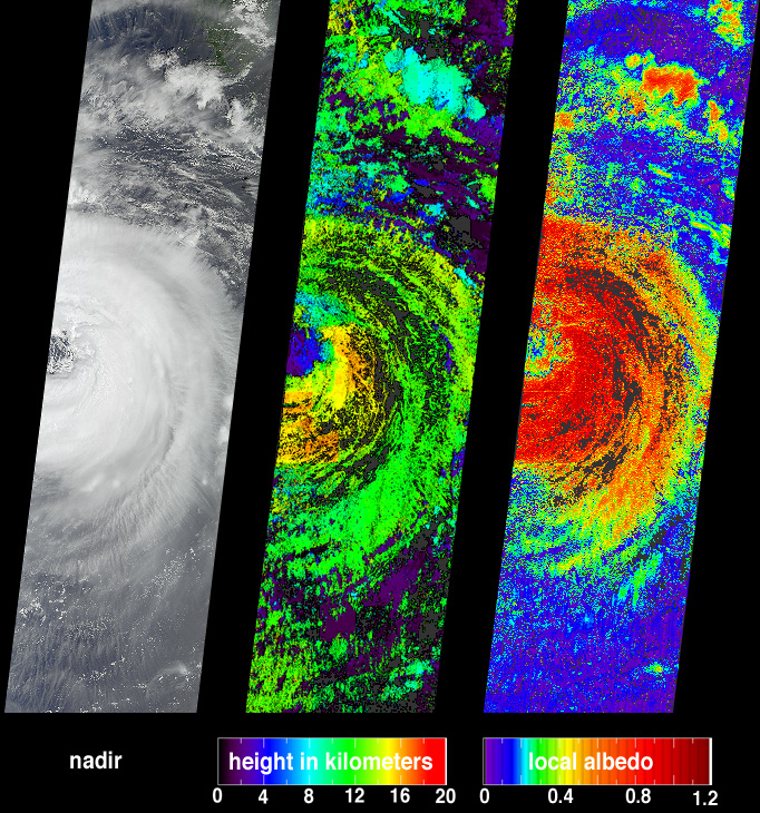 Clouds have a significant influence on the global radiation balance of theEarth’s atmosphere, and the improvement of climate models requires more accurateinformation on how different types of clouds influence Earth’s energy budget.One measure of this influence is albedo, which is the amount of sunlightreflected back to space divided by amount of incident sunlight. Bright objectshave high albedo. Retrieved local albedo values for Typhoon Sinlaku are shown atright. Generation of this product is dependent on observed cloud radiances as afunction of viewing angle and the cloud height field. Over the short distances(2.2 kilometers) that MISR’s local albedo product is generated, values can begreater than 1.0 due to the contributions from the sides of the clouds. Areaswhere albedo could not be retrieved are shown in dark gray.