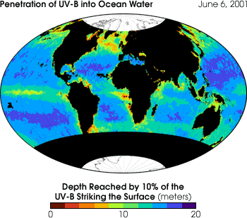 UV-B exposure decreases rapidly at increasing depths in the water column. In other words, water and the impurities in it strongly absorb and scatter incoming UV-B radiation. Some substances that are dissolved in water, such as organic carbon from nearby land, will also absorb UV-B radiation and enhance protection of microorganisms, plants, and animals from UV-B. Different masses of water at different locations contain different amounts of such dissolved substances and other particles, making evaluation of UV damage very difficult.