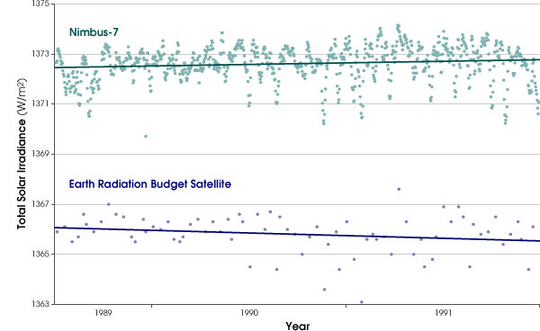 Such joining of data sets can be tricky. While all six of the Sun-monitoring instruments launched between 1978 and the present show the same general trend in total solar irradiance—going up at the solar maximum and falling off during solar minimum—none of them has recorded the same absolute value. During the solar maximum of 1980, NIMBUS 7-ERB recorded the total solar irradiance as about 1,374 watts of energy per square meter, while ACRIM1 measured 1,369. At the following solar minimum, NIMBUS7-ERB recorded values around 1,371, while ACRIM1 recorded 1,367. Scientists can be confident that the general trend is for solar output to increase at solar maximum and decrease at solar minimum, but determining the absolute value at any of those times is a lot more troublesome.