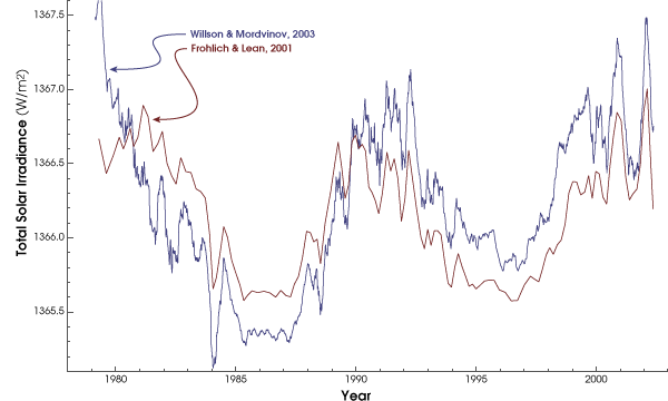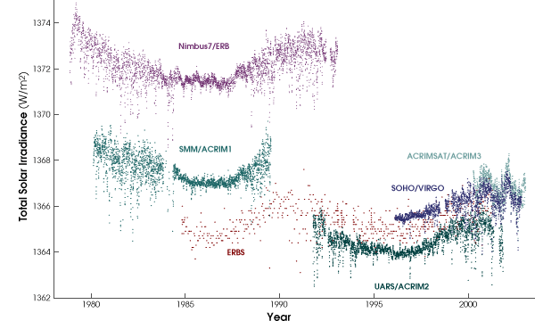 Not everyone agrees with how Willson put the data together. Claus Fröhlich, principal investigator for the VIRGO sensor on the SOHO mission, and Judith Lean made their own solar irradiance data set. One big difference between their approach and Willson’s is that they corrected the original results from NIMBUS 7-ERB for what they claim (in papers published in 1998 and 2002) are known sources of error caused by changes in the instrument over time. As an example, Lean points out that the first results from NIMBUS 7-ERB show some clearly anomalous behavior that couldn’t possibly be real—such as a sharp spike in recorded measurements right at the start of the mission. NIMBUS 7 didn’t have any self-checking capability of its own to help scientists correct for this unusual behavior, but when the VIRGO sensor came along, Fröhlich noticed that it behaved very much like NIMBUS 7 right after launch—also showing a spike in total solar irradiance at the start of the mission. Fröhlich and Lean corrected the NIMBUS-7 results partly based on the similarities between those two sensors and partly on additional comparisons with a third data set: NASA’s ERBS-ERBE, launched in 1984.