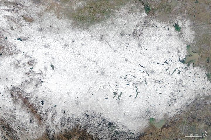 On January 10, 2018, the Moderate Resolution Imaging Spectroradiometer (MODIS) on NASA’s Terra satellite acquired an image (top) showing snowfall across central China. Notice how cities stand out as dark gray spots against the otherwise white terrain.