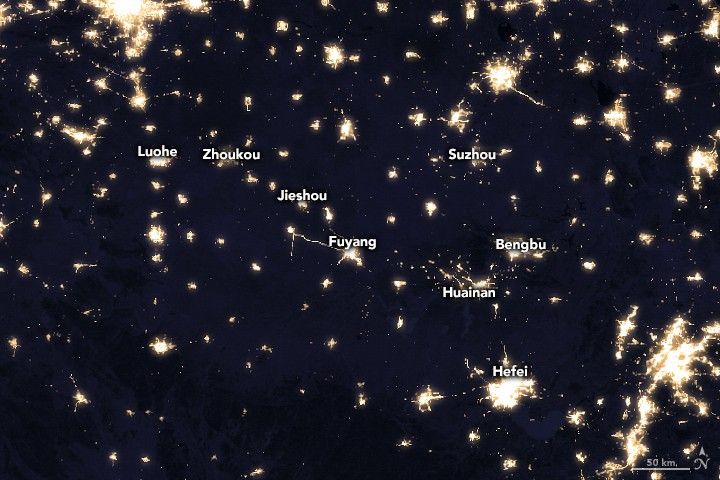 The second image shows another indicator of human presence—nighttime lights—in the same area. The image comes from a global composite produced in 2016 with data from the Visible Infrared Imaging Radiometer Suite (VIIRS) on the NASA-NOAA Suomi NPP satellite. VIIRS includes a special “day/night band,” a low-light sensor that measures light emissions and reflections, allowing researchers to distinguish the intensity, types, and sources of night lights. Turn on the image comparison tool to see how the patterns overlap.
