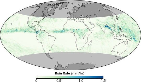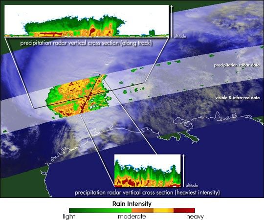 It was with these questions in mind—do cities influence rain and if so how—that Shepherd set out to see what NASA satellite data could contribute. The satellite data he had been looking at when he noticed the apparent urban rain anomaly in the first place were from a satellite called the Tropical Rainfall Measuring Mission (TRMM). Among its suite of instruments, TRMM (which scientists pronounce “trim”) carries the world’s only space-based precipitation radar. Like the radar that you see on the evening weather report, TRMM’s Precipitation Radar bounces radio waves through the atmosphere to measure rainfall. The difference is that all other radar systems are ground-based, and therefore have a limited range, whereas TRMM can observe everywhere between about 40 degrees north and south. When combined with GOES weather satellite and rain-gauge data, the rain data analysis can be extended to even higher latitudes. What’s more, because rainfall is measured with a single instrument, TRMM’s estimates in one city can be compared to estimates from another city, something that is difficult to do with two different ground-based systems.