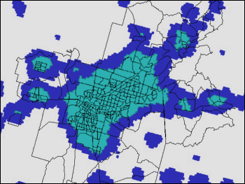 Imhoff says he came across a solution when he discovered satellite images displaying the illumination that cities and towns generate at night. The images were taken by Defense Meteorological Satellite Program’s Operational Linescan System (OLS). The satellite network was originally designed to aid in aircraft navigation by detecting the lunar illumination off of nighttime clouds. What the Air Force realized is that on evenings when there was a new moon, the satellite was sensitive enough to record the illumination from city lights. Over a period of several new moons, the data the satellite retrieved could be pieced together to produce a global image of city lights.