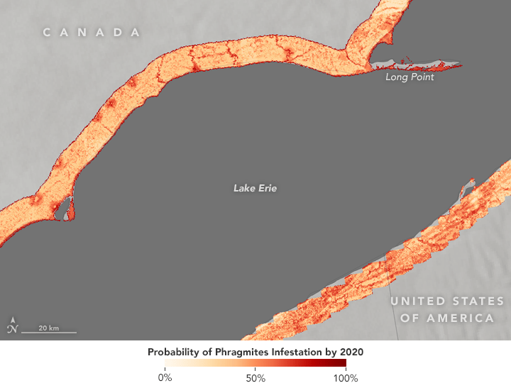 Recently, wildlife managers gained a new tool to understand phragmites around the Great Lakes. Building upon research by the Michigan Tech Research Institute and the U.S. Geological Survey, researchers from the Great Lakes and St. Lawrence Cities Initiative and NASA’s DEVELOP applied sciences program created a mapping tool to identify current and future areas at risk of phragmites invasions. The researchers examined satellite data and matched it with ground-based observations of the coastal landscape, such as the roughness of the terrain, the distance from agriculture or roads, and the coldest seasonal temperature. Each factor affects the likelihood of phragmites growth.