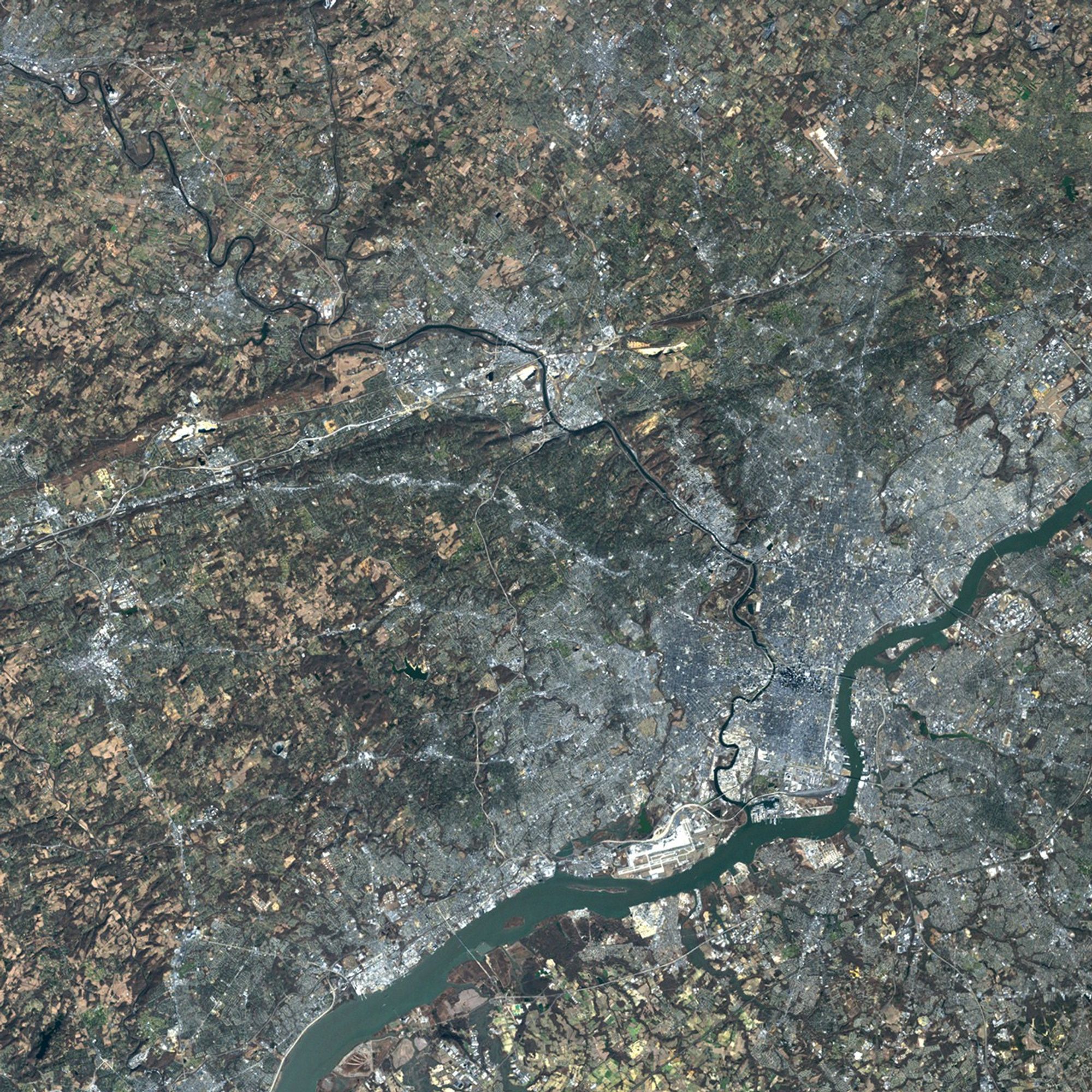 Today, Valley Forge is a national historical park near the junction of the Pottstown Expressway and the Pennsylvania Turnpike. On February 19, 2002, the Enhanced Thematic Mapper Plus sensor aboard the Landsat 7 satellite took this picture of Valley Forge and its surroundings, including the location of George Washtington’s headquarters and the Continental Army’s winter campsite. Also pictured is the Schuylkill River to the north.