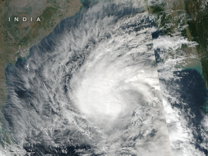 On December 11, 2016, the Moderate Resolution Imaging Spectroradiometer (MODIS) on NASA’s Terra satellite acquired a natural-color image of Vardah (above) as it churned in the Bay of Bengal. Around the same time, the U.S. Joint Typhoon Warning Center reported sustained winds of 75 knots (85 miles or 140 kilometers per hour) and gusts up to 90 knot gusts (105 mph or 165 kmph). Significant wave heights (in the open ocean) approached 24 feet (7.3 meters), and the center of the storm was approximately 640 nautical miles (1030 kilometers) south-southwest of Calcutta.