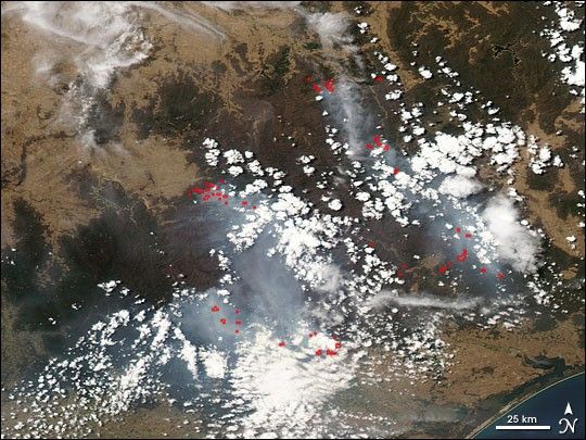 Rainfall in southeastern Australia in 2006 was well below average, and average temperatures for the continent in November 2006 hit a record high. The climate punished vegetation across the region. In November 2006, observations of vegetation conditions captured by the Moderate Resolution Imaging Spectroradiometer (MODIS) on NASA’s Terra satellite revealed how vegetation was struggling across much of the region. The image compares conditions in 2006 to the average November conditions from 2000-2005. All the brown areas indicate less abundant vegetation than the average. Only small, faint areas of slightly above-average vegetation conditions (green) are visible in a few locations. Gray areas indicate patches of missing data, perhaps due to persistent clouds or extremely bright soils (such as dry, salt-covered lake beds.)