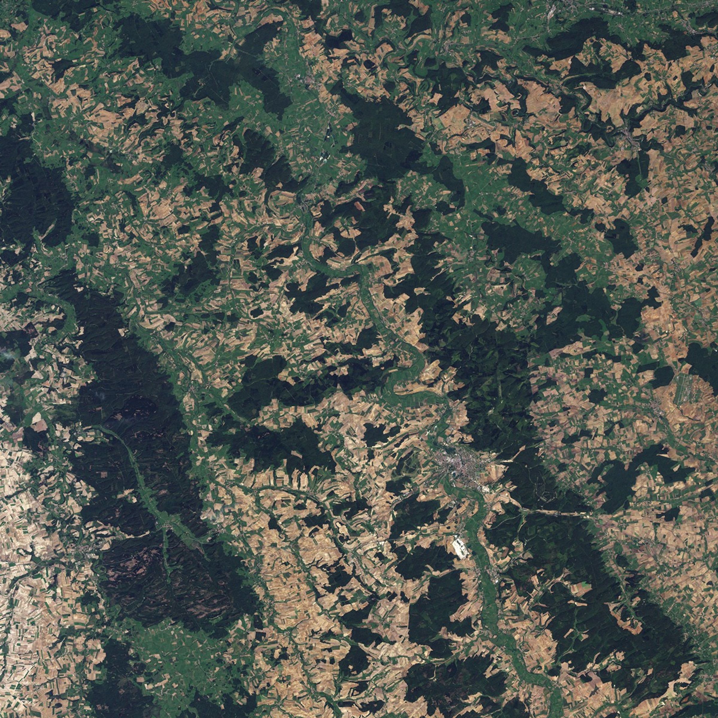 In this image, Verdun is a small city on the banks of the Meuse River surrounded by the geometric pattern of farmed and fallow fields. The river is framed by deep green woodlands. The front line during the Battle of Verdun passed through the now-heavily-wooded areas north of Verdun and curved clockwise (toward the southeast) through the strip of forest east of the river. (Maps and photographs show that some of the area was wooded at the time of the battle, as well).